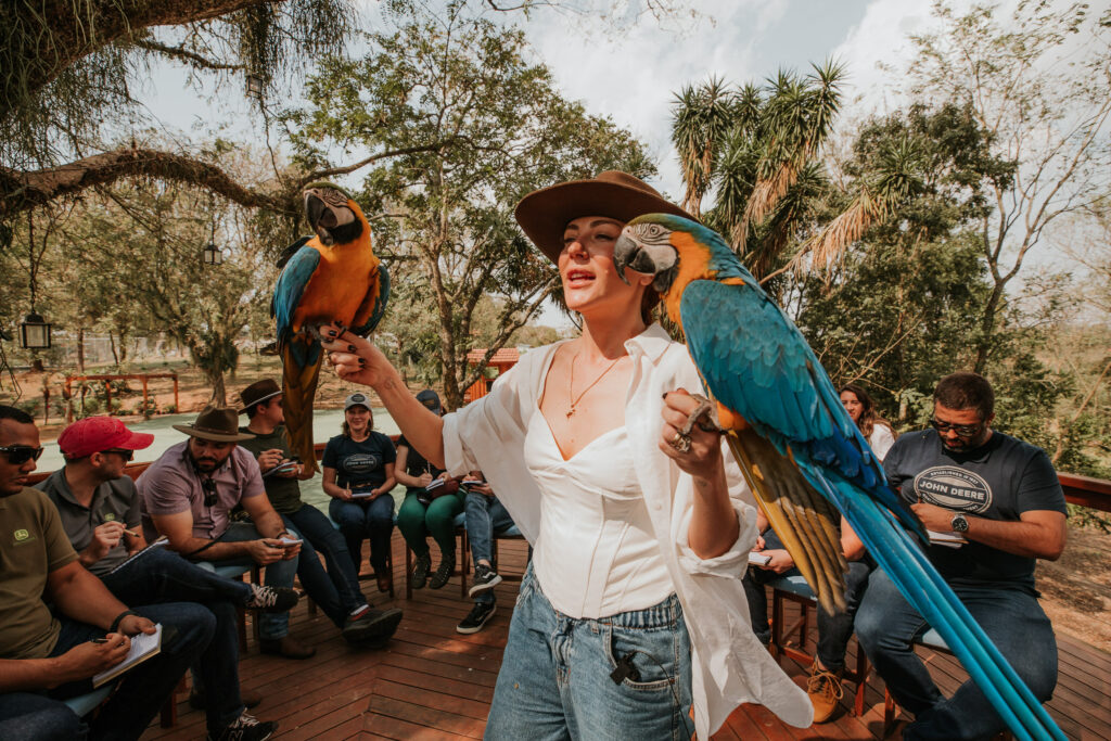 Hoje são três araras, Cocó, Dragão e Lara, que vivem aqui e cinco selvagens que visitam a fazenda. Mesmo com a liberdade de escolher qualquer lugar, elas escolhem ficar todos os dias, um reflexo de tudo que acreditamos e essa convivência demonstra que a verdadeira liderança, seja com animais ou pessoas, nasce da confiança, do respeito e da liberdade de escolha.
